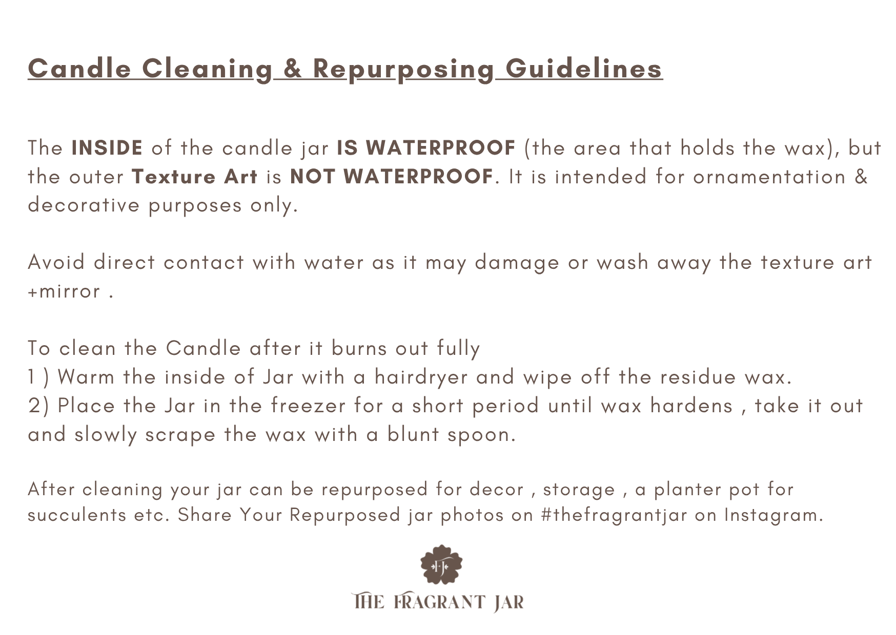 IMPORTANT NOTE : The Inside of our Candle Jar (the area that holds the wax) is WATERPROOF , However The texture art + mirror outside is NOT WATERPROOF and SHOULD NOT come in contact with water .It can result in the artwork getting damaged or washed out.