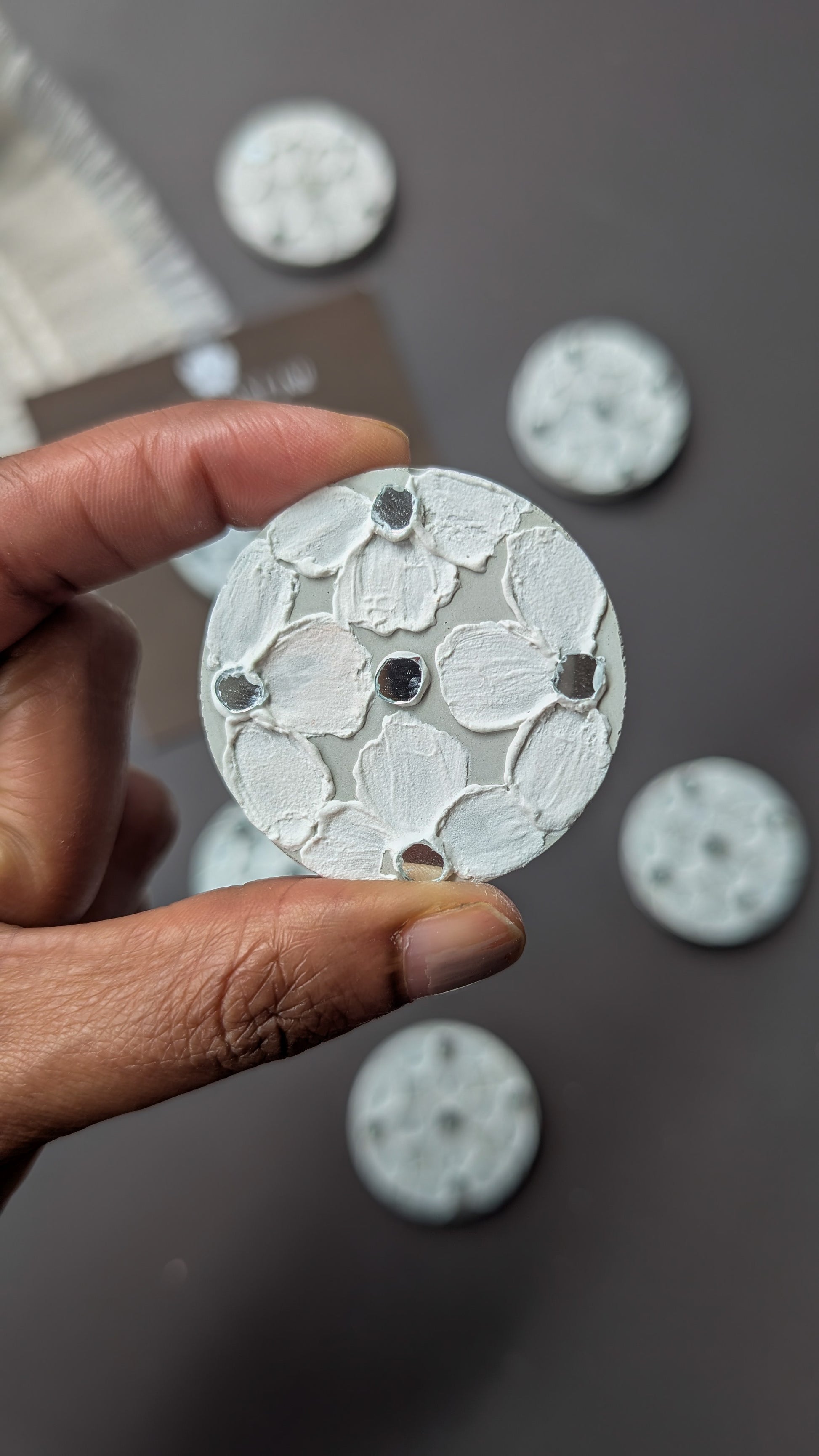 Add a touch of artisanal elegance to your home with our Handcrafted Concrete Fridge Magnets. Each magnet is carefully hand-textured with floral designs on a durable concrete base and enhanced with mirror inlay, making every piece a miniature work of art.